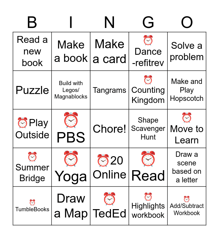 This bingo card has a free space and 24 words: ⏰Yoga, Draw a Map, Tangrams, ⏰TumbleBooks, Solve a problem, Read a new book, Puzzle, Make a book, Shape Scavenger Hunt, ⏰20 Online, ⏰Counting Kingdom, ⏰Play Outside, ⏰Read, Draw a scene based on a letter, Build with Legos/ Magnablocks, ⏰Highlights workbook, ⏰Move to Learn, Make a card, Make and Play Hopscotch, ⏰PBS, ⏰Add/Subtract Workbook, ⏰Summer Bridge, ⏰Dance -refitrev and ⏰TedEd.