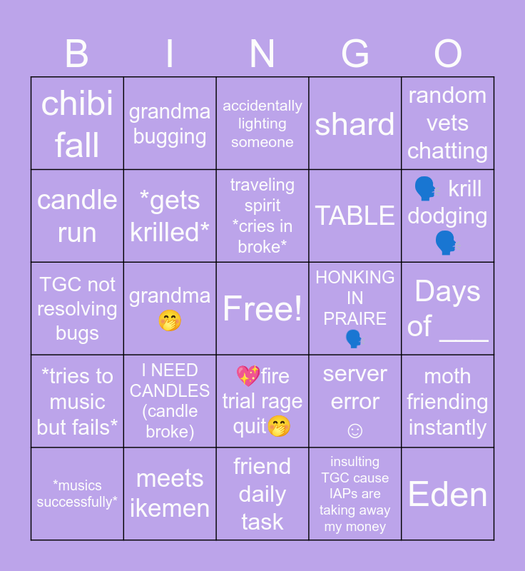 This bingo card has a free space and 38 words: Can't join friend, server merge, no players at big plants, *gets krilled*, moth friending instantly, I NEED CANDLES (candle broke), traveling spirit *cries in broke*, broke on hearts 🥲, random vets chatting, TABLE, grandma ðŸ¤, shard, Eden, Days of ___, candle run, *tries to music but fails*, moth playing like they were Chopin, accidentally lighting someone, can't jump off edges, HONKING IN PRAIRE 🗣, chibi fall, meets ikemen, 🗣 krill dodging 🗣, *musics successfully*, *cries in wasteland*, friend daily task, 💞admire sappling🥰, vault's silly doors w no players, forest's gates not working, OREO, no players at the butterfly door, 💖fire trial rage quitðŸ¤, insulting TGC cause IAPs are taking away my money, grandma bugging, 📶 the wifi dying, server error ☺, TGC not resolving bugs and players disappearing into nothingness.