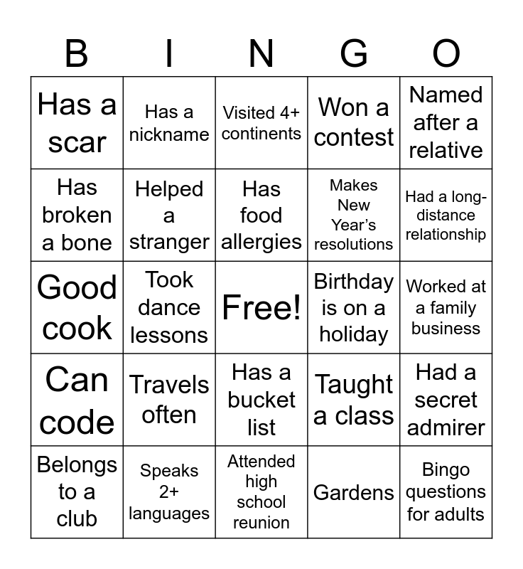 This bingo card has a free space and 25 words: Travels often, Attended high school reunion, Has food allergies, Belongs to a club, Named after a relative, Has a scar, Has broken a bone, Has a nickname, Birthday is on a holiday, Has a bucket list, Makes New Year’s resolutions, Good cook, Taught a class, Had a secret admirer, Helped a stranger, Got help from a stranger, Worked at a family business, Visited 4+ continents, Had a long-distance relationship, Took dance lessons, Bingo questions for adults, Speaks 2+ languages, Can code, Won a contest and Gardens.
