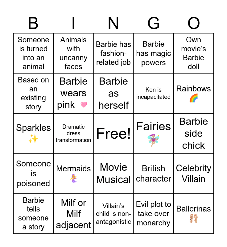 This bingo card has a free space and 24 words: Mermaids 🧜♀️, Milf or Milf adjacent, Barbie as herself, Barbie tells someone a story, Own movie’s Barbie doll, Someone is turned into an animal, Based on an existing story, Animals with uncanny faces, Fairies 🧚🏼♀️, Movie Musical, Ken is incapacitated, Sparkles ✨, British character, Celebrity Villain, Barbie wears pink 🩷, Evil plot to take over monarchy, Barbie side chick, Barbie has fashion-related job, Rainbows 🌈, Dramatic dress transformation, Ballerinas 🩰, Someone is poisoned, Barbie has magic powers and Villain’s child is non-antagonistic.