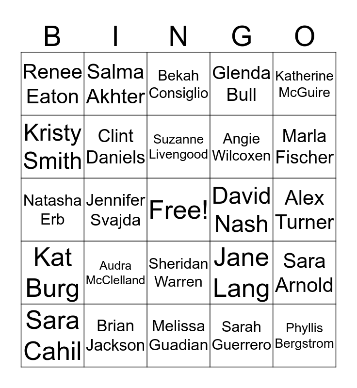 This bingo card has a free space and 33 words: Kaci Adams, Jeremi Wonch, Jennifer Svajda, Taylar Rabel, Kat Burg, Clint Daniels, Katherine McGuire, Sara Cahil, Salma Akhter, Tim Murray, Suzanne Livengood, Bekah Consiglio, Jordan Billings, Jodie Buster, David Nash, Marla Fischer, Brian Jackson, Natasha Erb, Audra McClelland, Jane Lang, Sheridan Warren, Tim Bettega, Renee Eaton, Alex Turner, Melissa Guadian, Phyllis Bergstrom, Glenda Bull, Angie Wilcoxen, Kristy Smith, Sara Arnold, Cathy Phillips, Sarah Guerrero and Shane Kaberline.