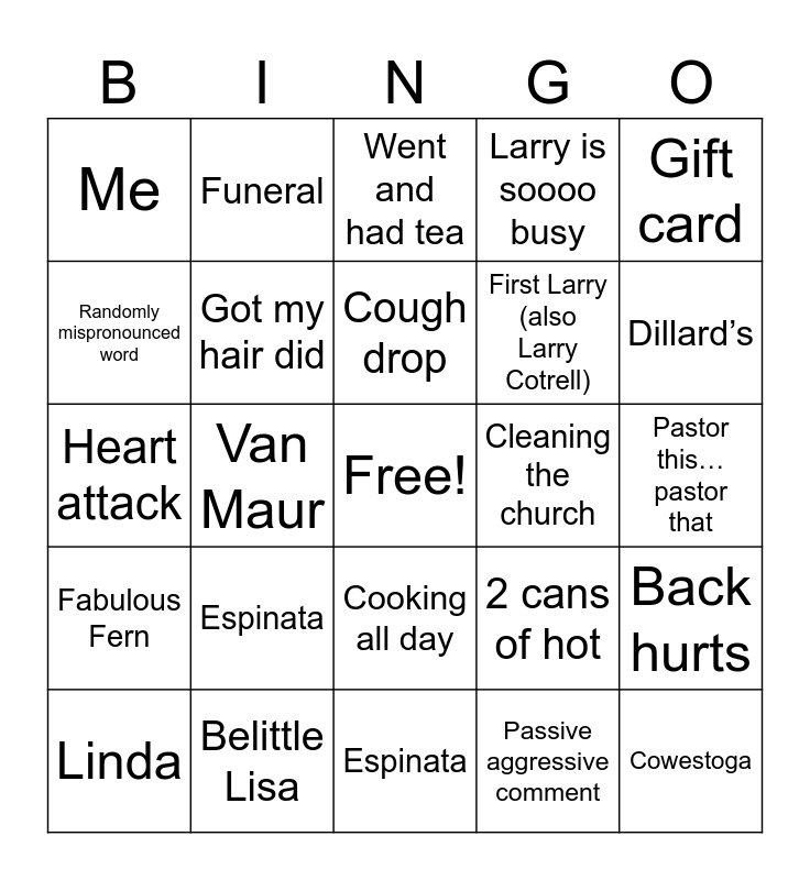 This bingo card has a free space and 25 words: Espinata, Espinata, Cough drop, Linda, Gift card, Me, Randomly mispronounced word, Funeral, Cleaning the church, Cooking all day, First Larry (also Larry Cotrell), Heart attack, 2 cans of hot, Back hurts, Got my hair did, I’m making enchiladas for you boys, Pastor this…pastor that, Went and had tea, Dillard’s, Van Maur, Cowestoga, Belittle Lisa, Fabulous Fern, Larry is soooo busy and Passive aggressive comment.