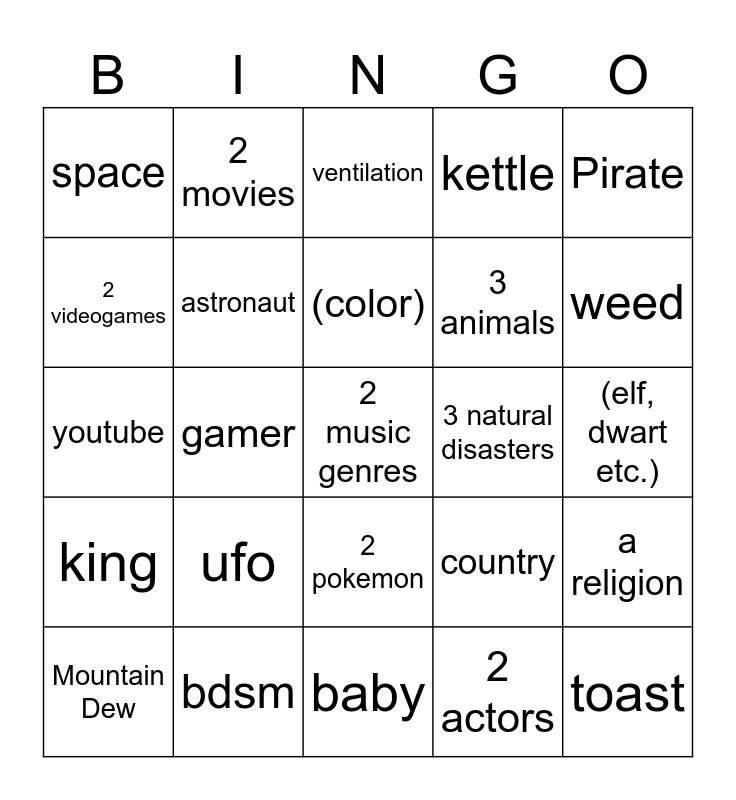 This bingo card has a free space and 24 words: ufo, bdsm, (color), Mountain Dew, Pirate, space, 2 videogames, 2 movies, 3 natural disasters, 2 pokemon, 3 animals, youtube, country, a religion, astronaut, 2 actors, (elf, dwart etc.), ventilation, weed, gamer, toast, king, kettle and baby.