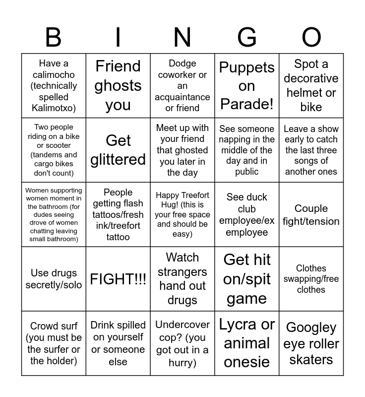 This bingo card has a free space and 34 words: Couple matching outfits (tracksuit or ski suit), Lycra or animal onesie, One of your friends asks people for drugs in the street, Get in the PIT!!!, Use drugs secretly/solo, Get glittered, Spot a decorative helmet or bike, Crowd surf (you must be the surfer or the holder), Friend ghosts you, YOU (person that seems squeaky clean) do drugs/drink/smoke, Meet up with your friend that ghosted you later in the day, Dodge coworker or an acquaintance or friend, See Doug Marsh (not on stage), See a band that you like on the street & tell em good job, See duck club employee/ex employee, Leave a show early to catch the last three songs of another ones, Drink spilled on yourself or someone else, Women supporting women moment in the bathroom (for dudes seeing drove of women chatting leaving small bathroom), FIGHT!!!, Get hit on/spit game, Watch strangers hand out drugs, Sneak in booze to main stage, Have a calimocho (technically spelled Kalimotxo), Couple fight/tension, Undercover cop? (you got out in a hurry), Googley eye roller skaters, Puppets on Parade!, Watch people mouth words that are not the words, See someone napping in the middle of the day and in public, Two people riding on a bike or scooter (tandems and cargo bikes don't count), Someone huddled away alone quickly scarfing food (could be yourself), People getting flash tattoos/fresh ink/treefort tattoo, Clothes swapping/free clothes and Dodge an ex or old flame.