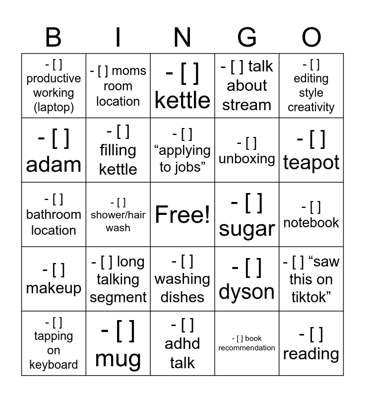 This bingo card has a free space and 30 words: - [ ] mug, - [ ] darius, - [ ] shower/hair wash, - [ ] skin care, - [ ] productive working (laptop), - [ ] kettle, - [ ] filling kettle, - [ ] washing dishes, - [ ] sugar, - [ ] adhd talk, - [ ] notebook, - [ ] reading, - [ ] book recommendation, - [ ] saying she’s trying to better something, - [ ] teapot, - [ ] “routine”, - [ ] dyson, - [ ] makeup, - [ ] long talking segment, - [ ] editing style creativity, - [ ] bathroom location, - [ ] kitchen location, - [ ] moms room location, - [ ] unboxing, - [ ] adam, - [ ] talk about stream, - [ ] “saw this on tiktok”, - [ ] tapping on keyboard, - [ ] “applying to jobs” and - [ ] “got distracted by my phone”.