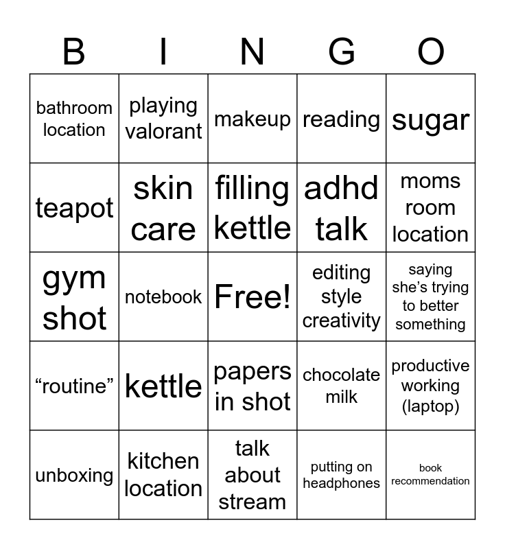 This bingo card has a free space and 38 words: mug, darius, shower/hair wash, skin care, productive working (laptop), kettle, filling kettle, washing dishes, sugar, adhd talk, notebook, reading, book recommendation, saying she’s trying to better something, teapot, “routine”, dyson, makeup, long talking segment, editing style creativity, bathroom location, kitchen location, moms room location, unboxing, adam, talk about stream, “saw this on tiktok”, tapping on keyboard, “applying to jobs”, “got distracted by my phone”, random food in shot, papers in shot, putting on headphones, playing valorant, mom walking in bg, chocolate milk, gym shot and “it’s hard for me to do this”.