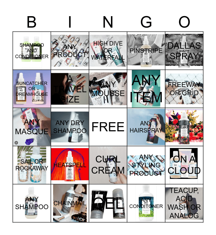 This bingo card has 24 images, a free space and 24 words: ANY SHAMPOO, HEATSPELL, ANY MOUSSE, ANY CONDITONER, DALLAS SPRAY, SHAMPOO AND CONDITIONER, ANY PRODUCT, HIGH DIVE OR WATERFALL, ANY HAIRSPRAY, CENTERPIECE, ANY MASQUE, A TRAVEL SIZE, ANY STYLING PRODUCT, ON A CLOUD, SUNCATCHER OR DREAMHOUSE, CHAINMAIL, GEL, PINSTRIPE, FREEWAY OR GRID, SAIL OR ROCKAWAY, ANY DRY SHAMPOO, CURL CREAM, ANY ITEM and TEACUP, ACID WASH OR ANALOG.