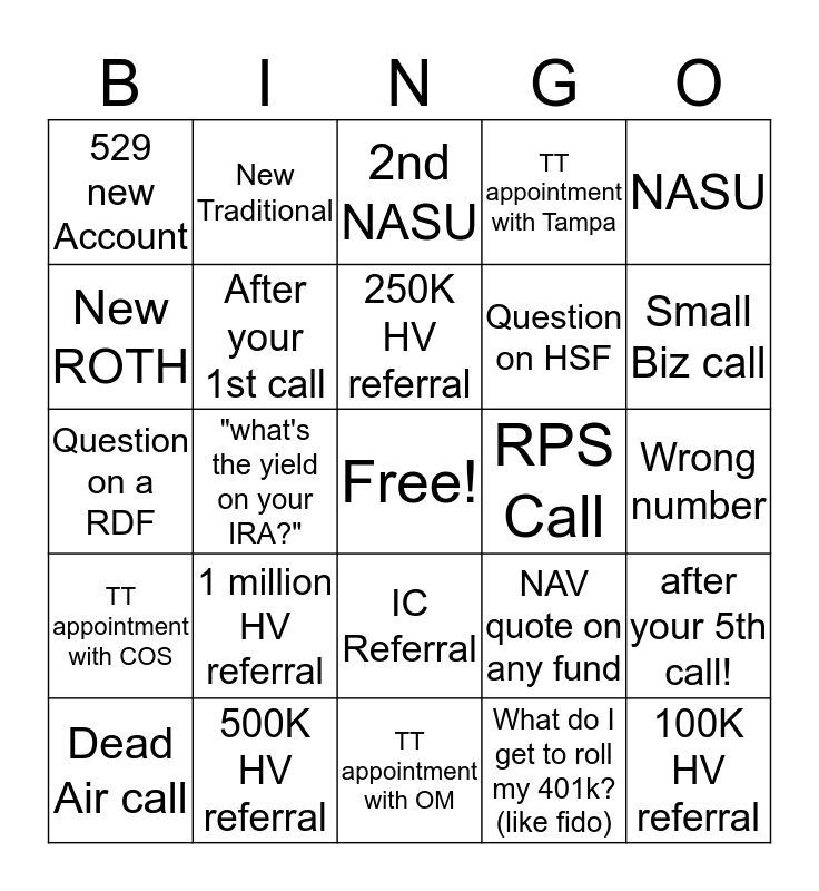 This bingo card has a free space and 24 words: 1 million HV referral, 500K HV referral, 250K HV referral, Dead Air call, NASU, 529 new Account, New ROTH, New Traditional, RPS Call, IC Referral, Question on HSF, Question on a RDF, NAV quote on any fund, after your 5th call!, After your 1st call, What do I get to roll my 401k?(like fido), Wrong number, 2nd NASU, Small Biz call, "what's the yield on your IRA?", 100K HV referral, TT appointment with COS, TT appointment with Tampa and TT appointment with OM.