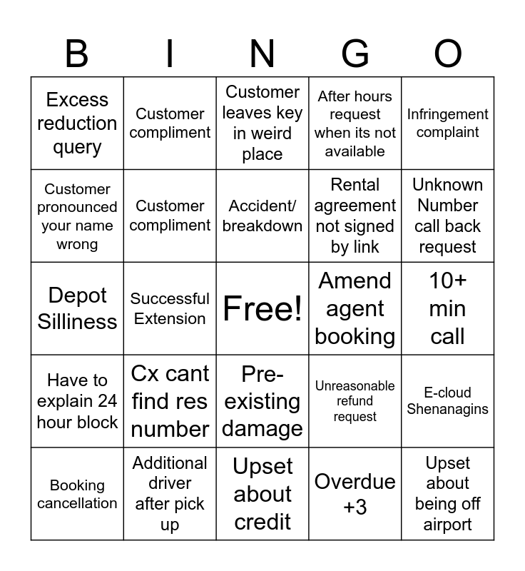 This bingo card has a free space and 33 words: Pre auth query, Cancelled flight, Successful Extension, MG complaint, Have to explain 24 hour block, Customer compliment, Infringement complaint, Booking cancellation, Customer compliment, Customer calls for shuttle, Accident/ breakdown, Customer leaves key in weird place, Customer breaks T&C, Customer asks question thats on website, Amend agent booking, Unknown Number call back request, Additional driver after pick up, Depot Silliness, Cx cant find res number, Unreasonable refund request, Pre-existing damage, Overdue +1, Excess reduction query, 10+ min call, Upset about credit, Upset about being off airport, After hours request when its not available, Rental agreement not signed by link, Customer pronounced your name wrong, E-cloud Shenanagins, Fuel not full on pick up, Overdue +3 and Does the car have GPS?.