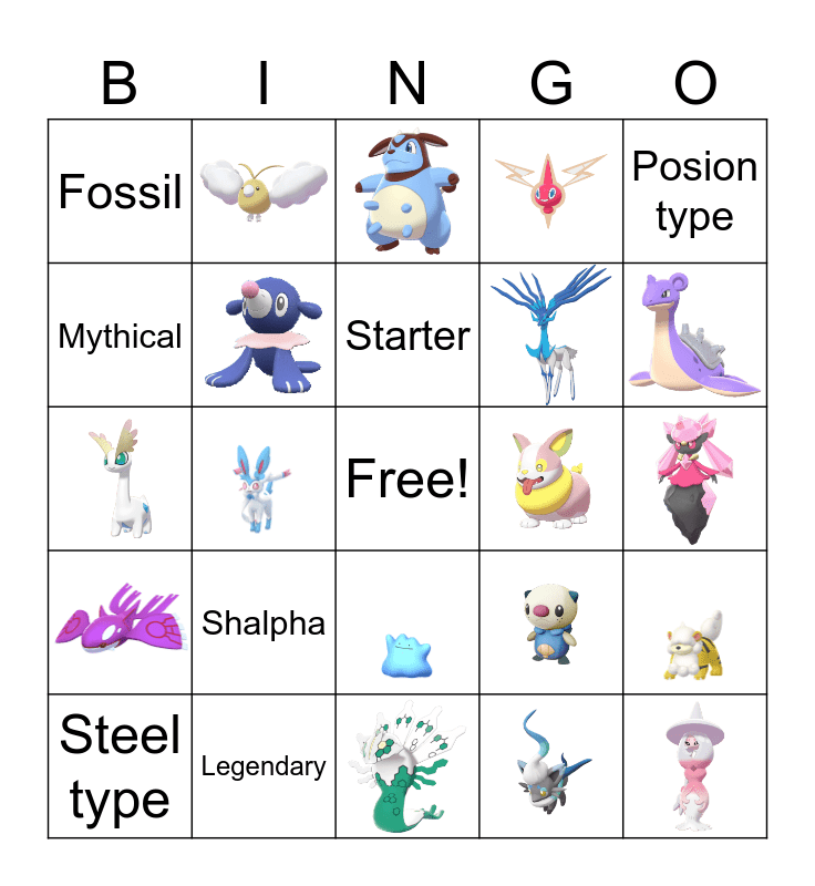 This bingo card has 17 images, a free space and 7 words: Shalpha, Legendary, Starter, Steel type, Posion type, Fossil and Mythical.
