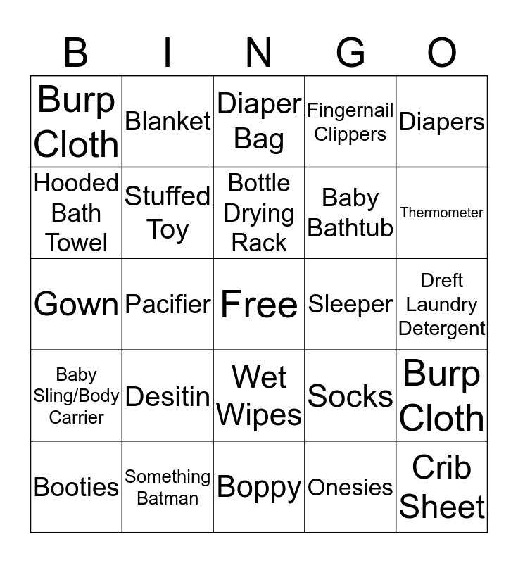 This bingo card has a free space and 24 words: Desitin, Something Batman, Bottle Drying Rack, Booties, Diapers, Burp Cloth, Hooded Bath Towel, Blanket, Sleeper, Wet Wipes, Baby Bathtub, Gown, Socks, Burp Cloth, Stuffed Toy, Onesies, Dreft Laundry Detergent, Diaper Bag, Thermometer, Pacifier, Crib Sheet, Baby Sling/Body Carrier, Fingernail Clippers and Boppy.