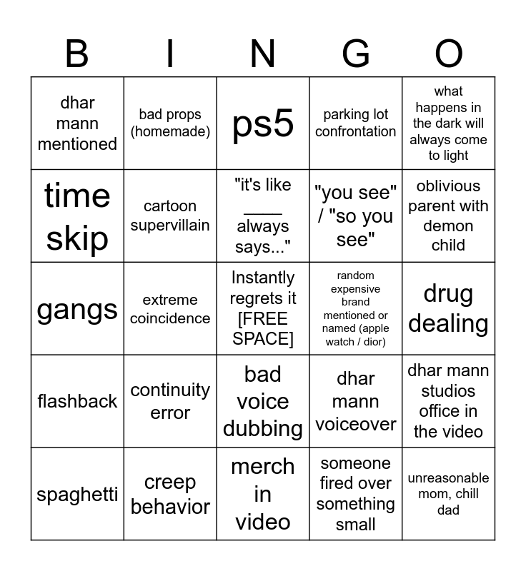 This bingo card has a free space and 27 words: dhar mann voiceover, dhar car, "you see" / "so you see", merch in video, time skip, ps5, bad props (homemade), flashback, random expensive brand mentioned or named (apple watch / dior), dhar mann studios office in the video, gangs, parking lot confrontation, spaghetti, creep behavior, oblivious parent with demon child, kids with ipad, cartoon supervillain, "it's like ____ always says...", continuity error, dhar mann mentioned, drug dealing, someone fired over something small, extreme coincidence, unreasonable mom, chill dad, bad voice dubbing, what happens in the dark will always come to light and black clothes to show home issues.