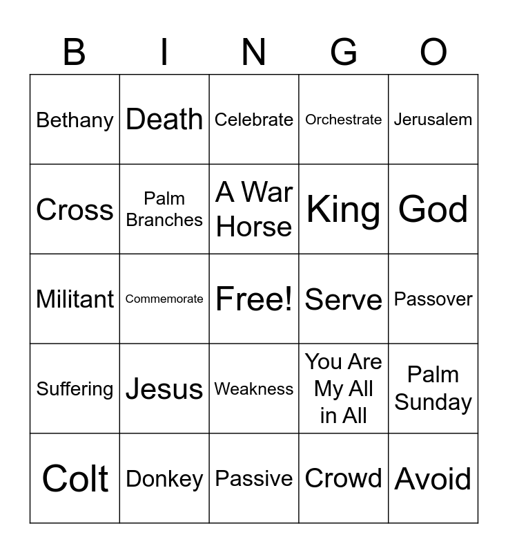 This bingo card has a free space and 24 words: Jesus, Donkey, A War Horse, Colt, Jerusalem, Bethany, Cross, Death, Serve, Weakness, King, Militant, You Are My All in All, Palm Sunday, Palm Branches, Crowd, Passover, Celebrate, God, Commemorate, Avoid, Suffering, Orchestrate and Passive.