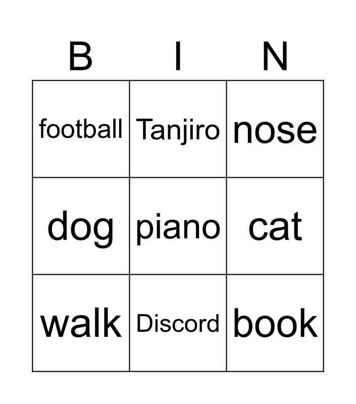 This bingo card has a free space and 8 words: cat, nose, Tanjiro, walk, football, book, dog and Discord.