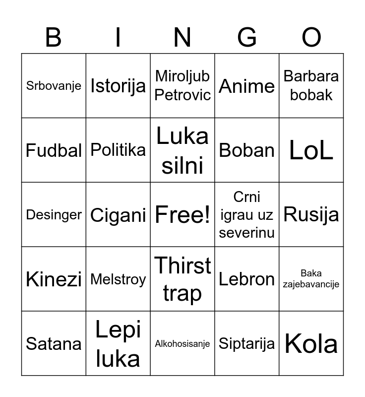 This bingo card has a free space and 24 words: Melstroy, Lepi luka, Luka silni, Satana, Barbara bobak, Srbovanje, Fudbal, Istorija, Crni igrau uz severinu, Thirst trap, Boban, Desinger, Lebron, Baka zajebavancije, Politika, Siptarija, Rusija, Miroljub Petrovic, LoL, Cigani, Kola, Kinezi, Anime and Alkohosisanje.