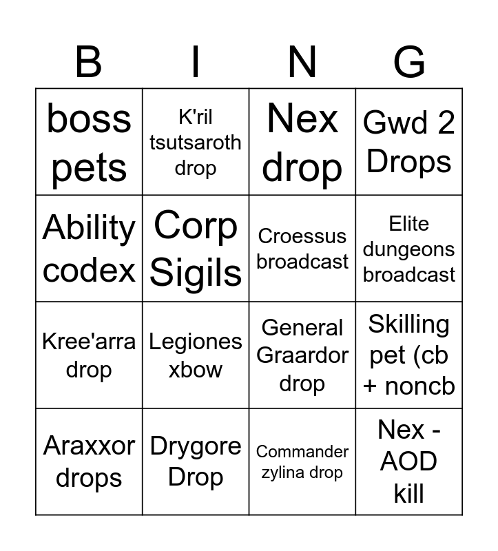 This bingo card has 16 words: Drygore Drop, Skilling pet (cb + noncb, Nex drop, boss pets, Kree'arra drop, K'ril tsutsaroth drop, General Graardor drop, Commander zylina drop, Ability codex, Corp Sigils, Araxxor drops, Gwd 2 Drops, Legiones xbow, Elite dungeons broadcast, Croessus broadcast and Nex - AOD kill.