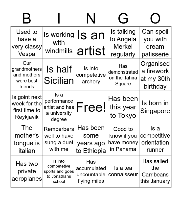 This bingo card has a free space and 24 words: Remberbers well to have sung a duet with me, Is into competetive sports and goes to Jonathans school, Is into competetive archery, Has two private aeroplanes, Can spoil you with dream patisserie, Used to have a very classy Vespa, Our grandmothers and mothers were best friends, Is working with windmills, Has been this year to Tokyo, Has been some years ago to Ethiopia, Has demonstrated on the Tahira Square, Is goint next week for the first time to Reykjavik, Good to know if you have money in Panama, Is a competitive orientation runner, Is half Sicilian, Is a tea connaisseur, Is born in Singapore, Is an artist, Organised a firework at my 30th birthday, Is a performance artist and has a university degree, Has sailed the Carribeans this January, The mother's tongue is italian, Is talking to Angela Merkel regularly and Has accumulated uncountable flying miles.