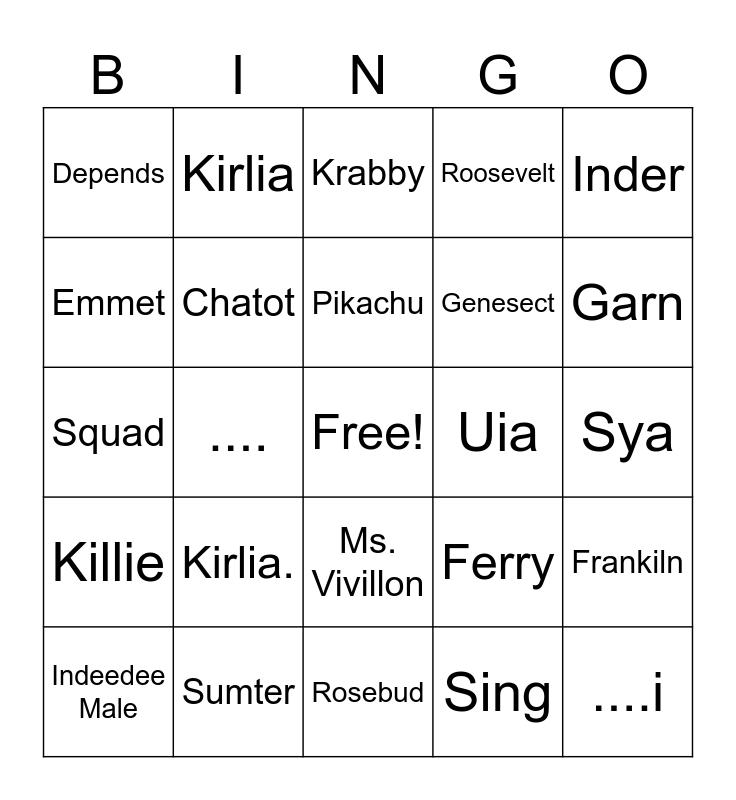 This bingo card has a free space and 24 words: Kirlia., Sumter, Pikachu, Indeedee Male, Inder, Depends, Emmet, Kirlia, Uia, Ms. Vivillon, Genesect, Squad, Ferry, Frankiln, Chatot, Sing, Sya, Krabby, Garn, ...., ....i, Killie, Roosevelt and Rosebud.