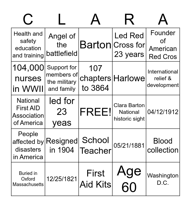 This bingo card has a free space and 24 words: Resigned in 1904, 12/25/1821, 107 chapters to 3864, Buried in Oxford Massachusetts, Founder of American Red Cros, Health and safety education and training, 104,000 nurses in WWII, Angel of the battlefield, Clara Barton National historic sight, School Teacher, Harlowe, National First AID Association of America, 05/21/1881, Blood collection, Support for members of the military and family, Age 60, 04/12/1912, Barton, International relief & development, led for 23 yeas, Washington D.C., People affected by disasters in America, Led Red Cross for 23 years and First Aid Kits.
