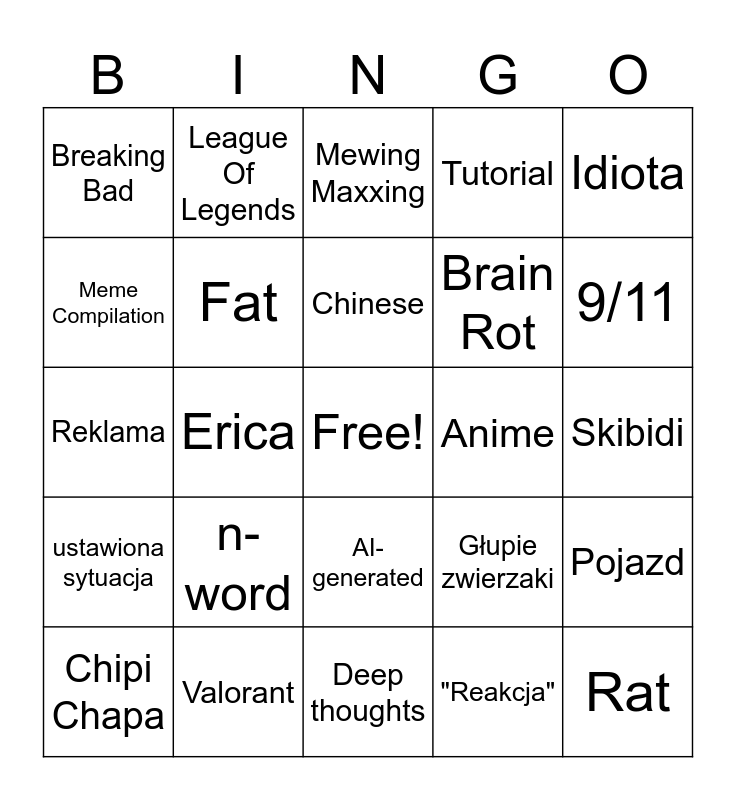 This bingo card has a free space and 24 words: n-word, Valorant, Chinese, Chipi Chapa, Idiota, Breaking Bad, Meme Compilation, League Of Legends, Anime, AI-generated, Brain Rot, Reklama, Głupie zwierzaki, Pojazd, Fat, "Reakcja", Skibidi, Mewing Maxxing, 9/11, Erica, Rat, ustawiona sytuacja, Tutorial and Deep thoughts.