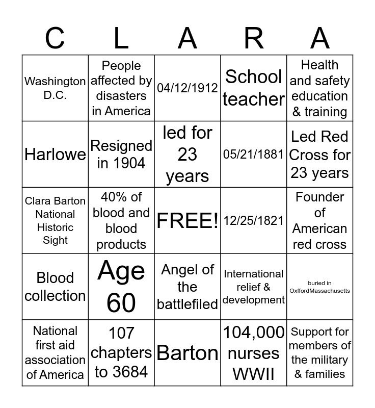 This bingo card has a free space and 24 words: Age 60, 107 chapters to 3684, led for 23 years, National first aid association of America, Health and safety education & training, Washington D.C., Harlowe, People affected by disasters in America, 12/25/1821, Angel of the battlefiled, 05/21/1881, Clara Barton National Historic Sight, International relief & development, buried in OxffordMassachusetts, Resigned in 1904, 104,000 nurses WWII, Founder of American red cross, 04/12/1912, Led Red Cross for 23 years, 40% of blood and blood products, Support for members of the military & families, Blood collection, School teacher and Barton.