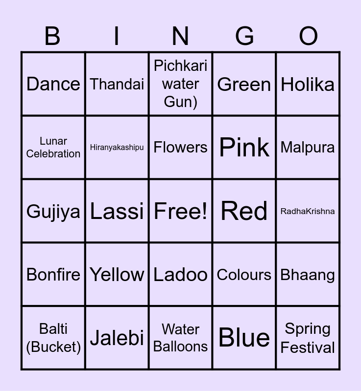 This bingo card has a free space and 24 words: Yellow, Jalebi, Flowers, Balti (Bucket), Holika, Dance, Lunar Celebration, Thandai, Red, Ladoo, Pink, Gujiya, Colours, Bhaang, Hiranyakashipu, Blue, RadhaKrishna, Pichkari water Gun), Malpura, Lassi, Spring Festival, Bonfire, Green and Water Balloons.