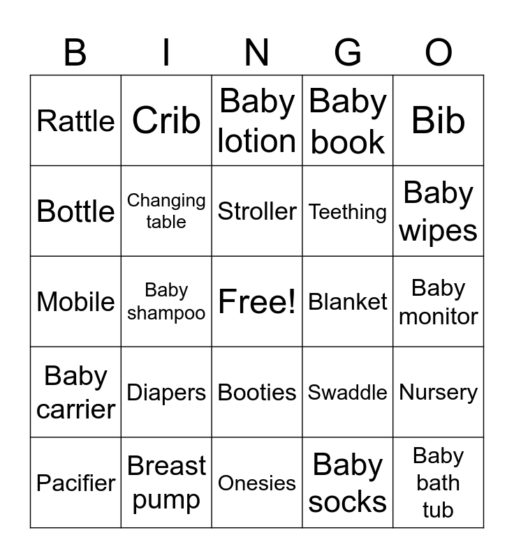 This bingo card has a free space and 25 words: Diapers, Onesies, Stroller, Pacifier, Bib, Rattle, Bottle, Crib, Blanket, Booties, Teething, Mobile, Swaddle, Nursery, Changing table, High chair, Baby monitor, Baby lotion, Baby wipes, Baby shampoo, Baby bath tub, Breast pump, Baby carrier, Baby book and Baby socks.