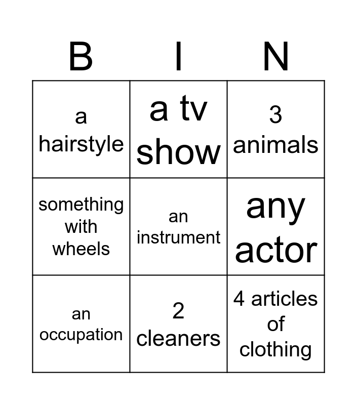 This bingo card has a free space and 8 words: any actor, 3 animals, a tv show, an occupation, a hairstyle, 4 articles of clothing, something with wheels and 2 cleaners.