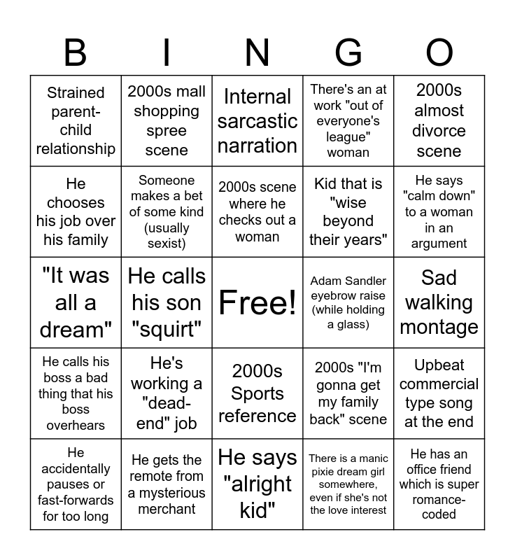 This bingo card has a free space and 24 words: He's working a "dead-end" job, He gets the remote from a mysterious merchant, 2000s scene where he checks out a woman, He accidentally pauses or fast-forwards for too long, 2000s almost divorce scene, Strained parent-child relationship, He chooses his job over his family, 2000s mall shopping spree scene, Adam Sandler eyebrow raise (while holding a glass), 2000s Sports reference, Kid that is "wise beyond their years", "It was all a dream", 2000s "I'm gonna get my family back" scene, Upbeat commercial type song at the end, Someone makes a bet of some kind (usually sexist), There is a manic pixie dream girl somewhere, even if she's not the love interest, Sad walking montage, Internal sarcastic narration, He says "calm down" to a woman in an argument, He calls his son "squirt", He has an office friend which is super romance-coded, He calls his boss a bad thing that his boss overhears, There's an at work "out of everyone's league" woman and He says "alright kid".