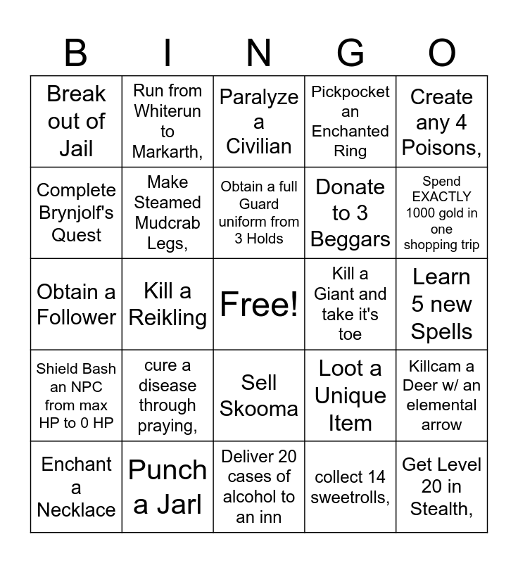 This bingo card has a free space and 90 words: Obtain a Dragon Claw, Obtain 5 Words of Power, Sell Skooma, Visit all 9 Hold Capitals, Complete a Quest, Meet both General Tullius & Ulfric Stormcloak, Join a Guild, Clear a Dungeon with no Weapons or Magic, Clear a Dungeon without healing, Win a Brawl, Rent a room in 5 different inns, Kill Grelod the Kind, Kill a Hagraven, Read 5 Skill Books, Learn 5 new Spells, Hold 10,000 Gold, Obtain a full Guard uniform from 3 Holds, Obtain 3 Flawless Gems, Bankrupt a Merchant, Murder an NPC in their home & wreck the place, Die to a Skeever, Kill a Guard with a Crossbow, Make a Pile of 10 Cheese Wheels, Deliver 20 cases of alcohol to an inn, 2,000 Total Bounty, Obtain a Follower, Punch a Jarl, Reach Level 10, Fill any Soul Gem, Interrupt Rogvir's Execution & Escape, Get Married, Steal A Dibella Statue, Killcam a Deer w/ an elemental arrow, Feed as a Vampire, Shield Bash an NPC from max HP to 0 HP, Break out of Jail, Pickpocket an Enchanted Ring, Paralyze a Civilian, Kill a Frost Troll, Kill a Reikling, Spend EXACTLY 1000 gold in one shopping trip, Enchant a Necklace, Complete Brynjolf's Quest, Enter a Player Home, Kill a Daedra, Kill an enemy using a trap, Loot a Unique Item, Pray to a Divine, Shoplift 200 gold value from 5 Separate Shops and get away with it, Kill one NPC from all playable races, see one NPC from all playable races, Speak to all 9 Jarls, Donate to 3 Beggars, Free a Prisoner from Capture, Contract 3 diseases, Sell a farmer all their own crops, Meet a Ghost, Kill a Giant and take it's toe, Perform a Kill with 3 weapon types, Fend off a contracted attempt on your life,, Learn one min. Apprentice Lvl Spell from all 5 schools, Go to 5 Main Cities, go to a minor city, learn 3 alteraton spells,, Pickpocket 1 Thing Off of 10 People,, Jump off the throat of the world,, Get Arrested in 3 Different Holds,, Collect 2 divine amulets, get married,, collect 14 sweetrolls,, Pay a bard,, Make a Leg of Goat Roast,, cure a disease through praying,, Get Level 20 in Stealth,, Kill a cultist,, go to fort dawnguard,, Run from Whiterun to Markarth,, Make Steamed Mudcrab Legs,, Make a stew,, catch a fish,, kill a dragon,, Have 15 Spells,, Go to Solstheim,, Create any 4 Poisons,, Collect and Sell 20 Cabbages to a Farmer,, cook 3 Different Soups,, get to 45 in a skill,, Get a Daedric Artifact,, collect 4 buckets,, learn a shout,, read 5 skill books, and Kill a thalmor.