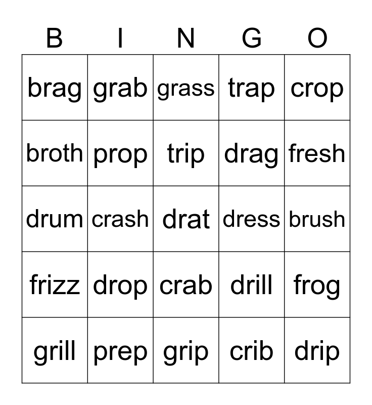 This bingo card has 25 words: drop, grip, trip, grill, crop, brag, broth, grab, dress, crab, drag, drum, drill, frog, prop, drip, brush, grass, fresh, crash, drat, prep, frizz, trap and crib.