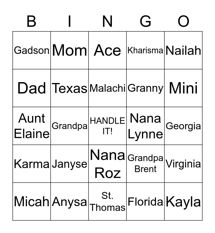 This bingo card has a free space and 24 words: Janyse, Anysa, Malachi, Micah, Nailah, Gadson, Dad, Mom, Nana Lynne, Nana Roz, Granny, Aunt Elaine, Grandpa Brent, Virginia, Texas, Florida, Georgia, Ace, Mini, Grandpa, Kayla, Karma, Kharisma and St. Thomas.