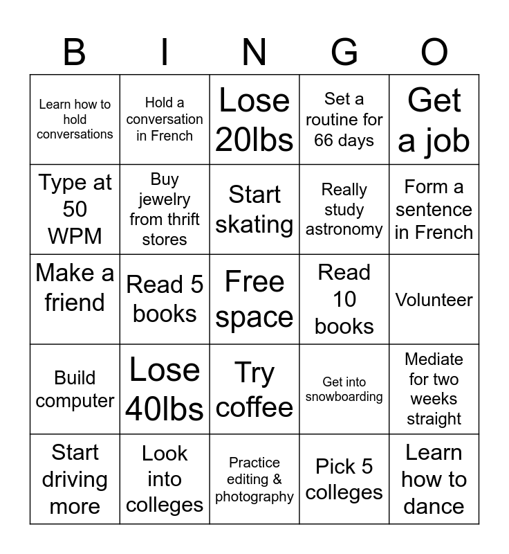 This bingo card has a free space and 24 words: Lose 40lbs, Look into colleges, Start skating, Start driving more, Get a job, Learn how to hold conversations, Type at 50 WPM, Hold a conversation in French, Read 10 books, Try coffee, Really study astronomy, Make a friend, Get into snowboarding, Mediate for two weeks straight, Buy jewelry from thrift stores, Pick 5 colleges, Volunteer, Lose 20lbs, Form a sentence in French, Read 5 books, Learn how to dance, Build computer, Set a routine for 66 days and Practice editing & photography.