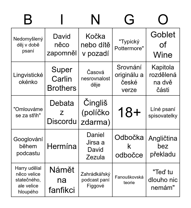 This bingo card has a free space and 40 words: "Nemáme moc poznámek", "Omlouváme se za střih", Návrh lepšího překladu, Super Carlin Brothers, Námět na fanfikci, Daniel Jirsa a David Zezula, Časová nesrovnalost děje, Idiot boy, Goblet of Wine, Googlování během podcastu, Debata z Discordu, "Typický Pottermore", "Teď tu dlouho nic nemám", Líné psaní spisovatelky, 18+, Hermína, Zmínění binga, Nedomyšlený děj v době psaní, Pochválení pěkně napsané pasáže, Kočka nebo dítě v pozadí, Angličtina bez překladu, Fanouškovská teorie, Srovnání originálu a české verze, Lingvistické okénko, Porovnávání s filmem, "Ještě před tím tam mám poznámku...", Srovnání anglické a americké verze, Oliver Švihák, "To je v [doplň díl]", Famfrpál nedává smysl, Tenhle koncept ještě neexistoval, Harry udělal něco velice statečného, ale velice hloupého, Debata o významu anglického slovíčka, Odbočka k odbočce, Kapitola rozdělená na dvě části, Zahrádkářský podcast paní Figgové, "To je ___, jestli to nevíš.", "Přesně to jsem si napsal taky", David něco zapomněl and Péče o kouzelné otvory.