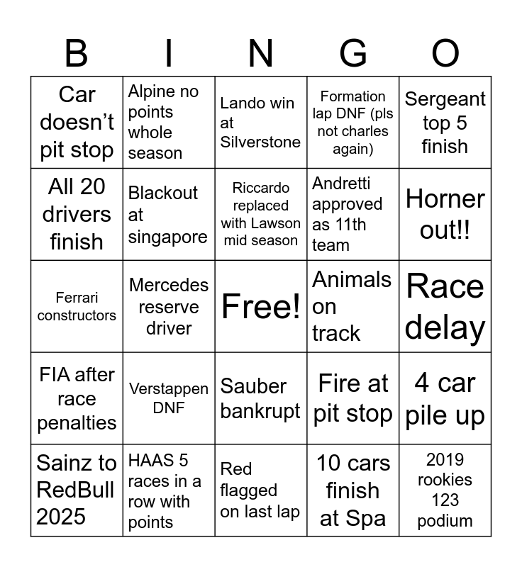 This bingo card has a free space and 24 words: Verstappen DNF, HAAS 5 races in a row with points, Riccardo replaced with Lawson mid season, Sainz to RedBull 2025, Sergeant top 5 finish, Car doesn’t pit stop, All 20 drivers finish, Alpine no points whole season, Animals on track, Sauber bankrupt, Andretti approved as 11th team, Ferrari constructors, Fire at pit stop, 4 car pile up, Blackout at singapore, 10 cars finish at Spa, Race delay, Lando win at Silverstone, Horner out!!, Mercedes reserve driver, 2019 rookies 123 podium, FIA after race penalties, Formation lap DNF (pls not charles again) and Red flagged on last lap.