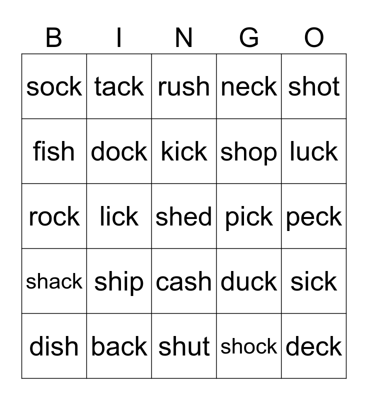 This bingo card has a free space and 24 words: ship, back, kick, dish, shot, sock, fish, tack, pick, cash, shop, rock, duck, sick, dock, shock, peck, rush, luck, lick, deck, shack, neck and shut.