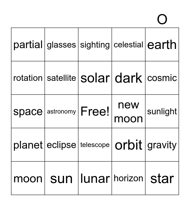 This bingo card has a free space and 24 words: eclipse, sun, solar, moon, earth, partial, rotation, glasses, new moon, telescope, dark, space, orbit, gravity, satellite, horizon, sunlight, sighting, cosmic, astronomy, star, planet, celestial and lunar.