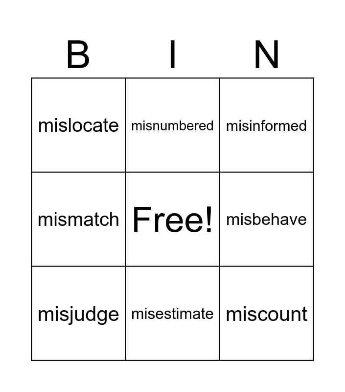 This bingo card has a free space and 8 words: misbehave, misinformed, misnumbered, misjudge, mislocate, miscount, mismatch and misestimate.