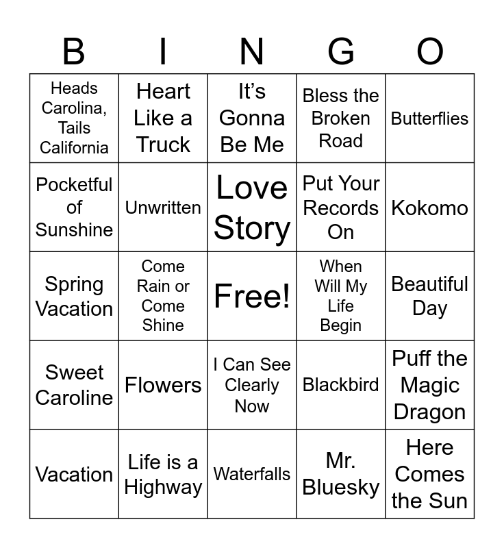 This bingo card has a free space and 24 words: Flowers, Life is a Highway, Love Story, Vacation, Butterflies, Heads Carolina, Tails California, Pocketful of Sunshine, Heart Like a Truck, When Will My Life Begin, I Can See Clearly Now, Put Your Records On, Spring Vacation, Blackbird, Puff the Magic Dragon, Unwritten, Mr. Bluesky, Beautiful Day, It’s Gonna Be Me, Kokomo, Come Rain or Come Shine, Here Comes the Sun, Sweet Caroline, Bless the Broken Road and Waterfalls.