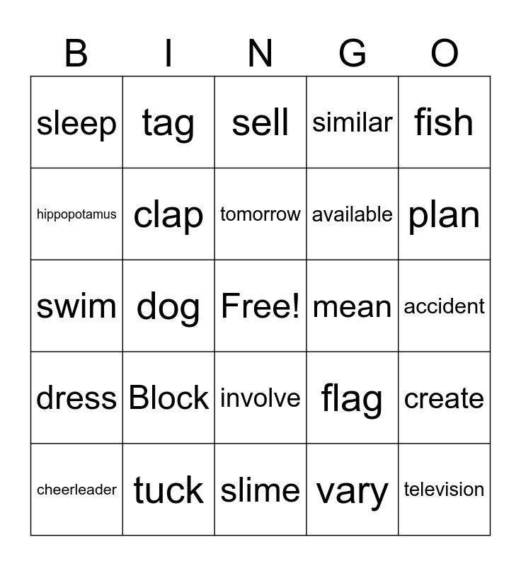 This bingo card has a free space and 24 words: Block, tuck, tomorrow, cheerleader, fish, sleep, hippopotamus, tag, mean, involve, available, swim, flag, create, clap, vary, accident, sell, plan, dog, television, dress, similar and slime.