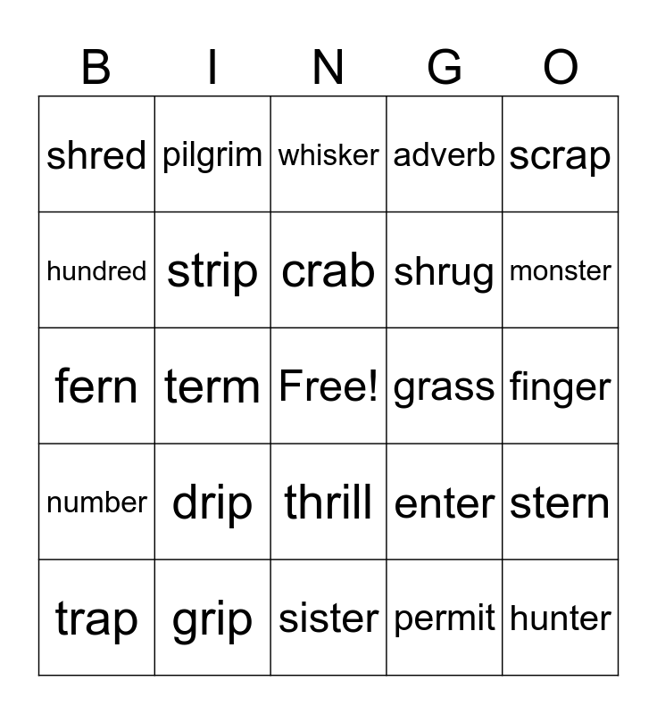 This bingo card has a free space and 24 words: drip, grip, crab, trap, scrap, shred, hundred, pilgrim, grass, thrill, shrug, fern, enter, stern, strip, permit, finger, whisker, monster, term, hunter, number, adverb and sister.