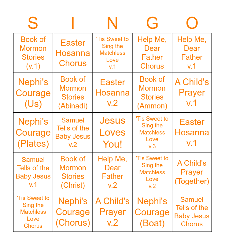 This bingo card has a free space and 24 words: Book of Mormon Stories (Christ), Nephi's Courage (Chorus), Easter Hosanna v.2, 'Tis Sweet to Sing the Matchless Love Chorus, Help Me, Dear Father v.1, Book of Mormon Stories (v.1), Nephi's Courage (Us), Easter Hosanna Chorus, 'Tis Sweet to Sing the Matchless Love v.3, Help Me, Dear Father v.2, Book of Mormon Stories (Ammon), Nephi's Courage (Plates), 'Tis Sweet to Sing the Matchless Love v.2, A Child's Prayer (Together), Book of Mormon Stories (Abinadi), Nephi's Courage (Boat), Easter Hosanna v.1, 'Tis Sweet to Sing the Matchless Love v.1, A Child's Prayer v.1, Samuel Tells of the Baby Jesus v.2, Samuel Tells of the Baby Jesus Chorus, Samuel Tells of the Baby Jesus v.1, Help Me, Dear Father Chorus and A Child's Prayer v.2.