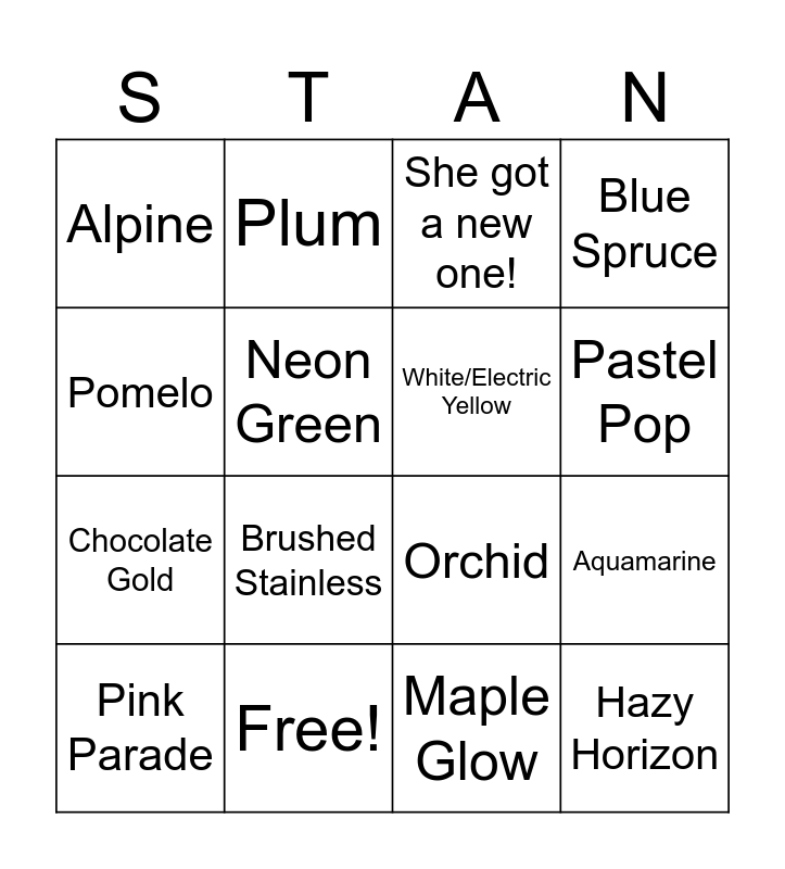 This bingo card has 16 words: Free!, Aquamarine, She got a new one!, Alpine, Chocolate Gold, Plum, Orchid, Maple Glow, Pomelo, Neon Green, Pink Parade, Blue Spruce, Brushed Stainless, Pastel Pop, White/Electric Yellow and Hazy Horizon.