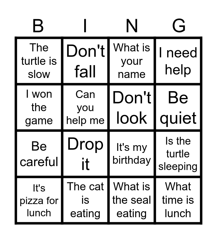 This bingo card has 16 words: The cat is eating, Is the turtle sleeping, What is your name, The turtle is slow, Be careful, Don't fall, It's my birthday, What is the seal eating, I won the game, Can you help me, It's pizza for lunch, I need help, Drop it, Be quiet, Don't look and What time is lunch.