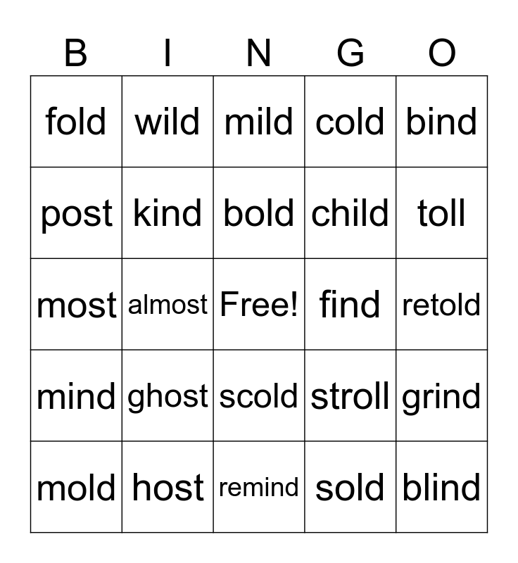 This bingo card has a free space and 24 words: ghost, host, bold, mold, bind, fold, post, wild, find, scold, child, most, stroll, grind, kind, sold, retold, mild, toll, almost, blind, mind, cold and remind.
