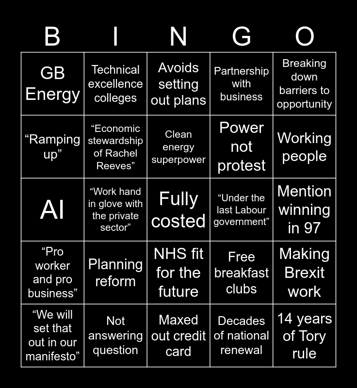 This bingo card has a free space and 39 words: “Keir has changed our party”, Mentions Liz Truss mini budget, Mentions losing in 2019, “Economic stewardship of Rachel Reeves”, “We will set that out in our manifesto”, NHS fit for the future, Clean energy superpower, Need to grow the economy, Breaking down barriers to opportunity, “Pro worker and pro business”, “Work hand in glove with the private sector”, Partnership with business, 14 years of Tory rule, Mention winning in 97, “Under the last Labour government”, Planning reform, National wealth fund, GB Energy, VAT on private school fees, Free breakfast clubs, “Ramping up”, Maxed out credit card, Power not protest, Working people, Sticking plasters, Smashing criminal gangs, Securonomics, No option for a life on benefits, Growth and skills levy, Technical excellence colleges, Pragmatic not ideological, New deal for working people, Avoids setting out plans, Not answering question, Decades of national renewal, Politics is about choices, Making Brexit work, AI and Private sector capacity in the NHS.