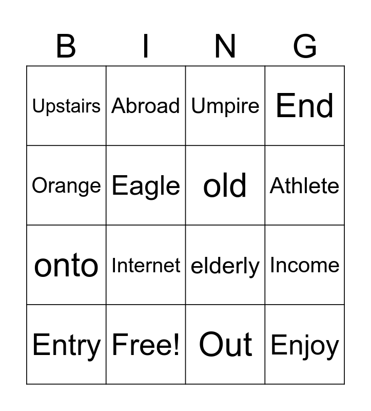 This bingo card has 24 words: Actor, Onion, Athlete, Umbrella, Orange, Upstairs, Eagle, Abroad, Free!, Angel, onto, elderly, Allergy, Echo, old, Encourage, Out, Umpire, Internet, Income, Entry, Enjoy, End and Entertainment.