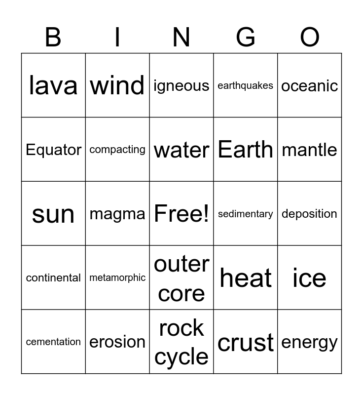 This bingo card has a free space and 29 words: cementation, melting, magma, weathering, lava, igneous, compacting, metamorphic, sedimentary, erosion, deposition, energy, rock cycle, crust, mantle, inner core, outer core, continental, oceanic, sun, heat, tectonic plates, Earth, Equator, earthquakes, wind, ice, water and crystallization.