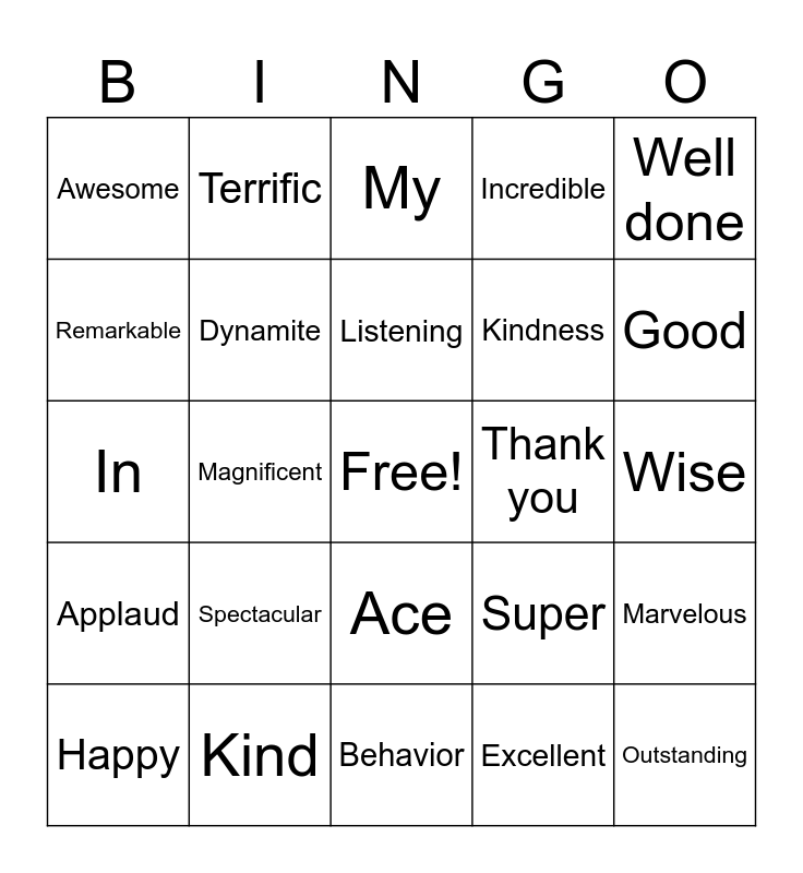 This bingo card has a free space and 49 words: Wow, Outstanding, Proud, Behavior, Spectacular, Super Star, Terrific, Fantastic, Remarkable, How smart, Dynamite, Incredible, Marvelous, Super, Amazing, Learning, Listening, Thank you, Way to go, Well done, Magnificent, Excellent, Awesome, Kindness, Great, Good, Happy, Helpful, Ace, Applaud, Appropriate, Attentive, Inspiring, Thoughtful, Kind, Beautiful, Best, Majestic, Wise, Respectful, Radiant, Fabulous, Nifty, Wonderful, In, My, Heart, Writing and Math.