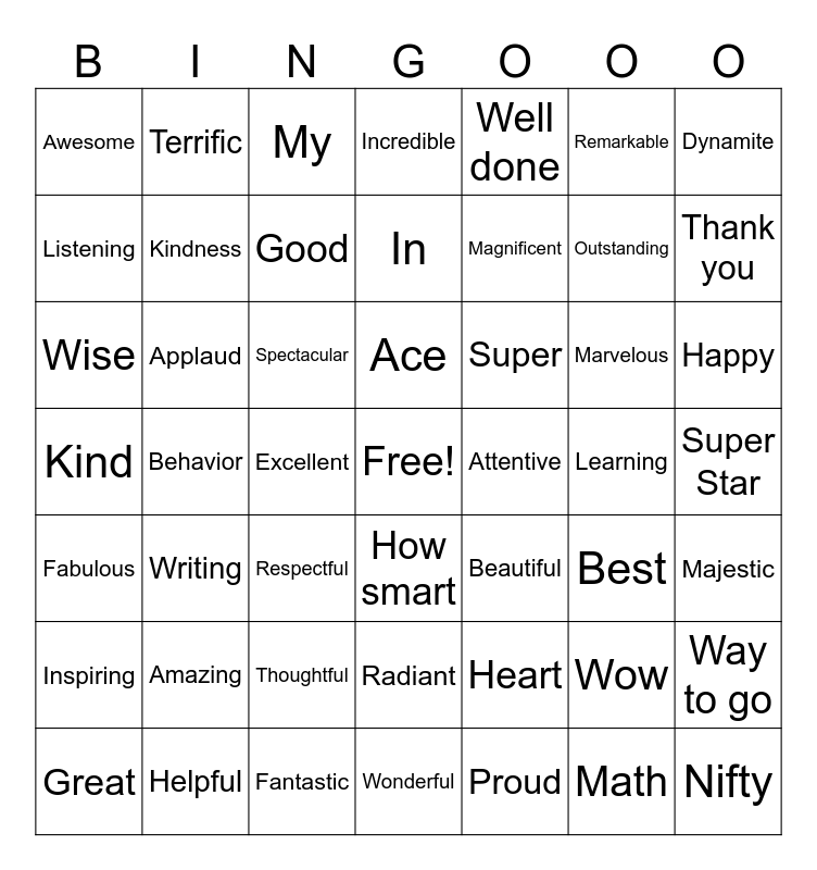 This bingo card has a free space and 49 words: Wow, Outstanding, Proud, Behavior, Spectacular, Super Star, Terrific, Fantastic, Remarkable, How smart, Dynamite, Incredible, Marvelous, Super, Amazing, Learning, Listening, Thank you, Way to go, Well done, Magnificent, Excellent, Awesome, Kindness, Great, Good, Happy, Helpful, Ace, Applaud, Appropriate, Attentive, Inspiring, Thoughtful, Kind, Beautiful, Best, Majestic, Wise, Respectful, Radiant, Fabulous, Nifty, Wonderful, In, My, Heart, Writing and Math.